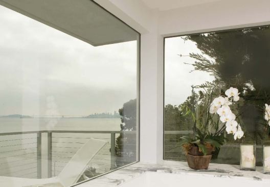 Unlike the kitchen, the master bath upstairs is anything but subdued. Here, the clients wanted a luxurious retreat from which they could savor the spectacular views of Alcatraz, Angel Island, and other prime San Francisco Bay locales. The room’s grand gesture is a marble-encased, nearly 2-foot-deep corner bathtub with sybaritic settings. “They see bathing as a heightened function,” English says of his clients, “so we raised the tub to give it sacred prominence.” A ceiling-mounted tub filler and a marble plinth enhance the tub’s ceremonial feel.