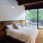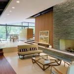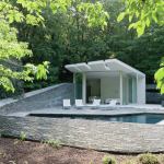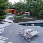 “Architects often think of buildings as an independent sculptural object that sits in landscape,” says Joel Sanders, AIA. “Our intention was to have the house recede, and what would catch your eye is this white lining that begins inside and goes down the hill.” Built on the solid foundation of a structurally unsound mid-century home, the remodel’s open-plan public zone has a dark shell with folded graphic elements—white concrete floors and countertops and a suspended drywall ceiling—that link the house, landscape, and pool house. Landscape architect Diana Balmori extended the concrete flooring outside as irregular pavers that interlace the landscape and wrap up over the pool house. “The stones in the swimming pool were set in the same way as the stone around the living-room fireplace,” she says. Our judges appreciated the “thoughtful way the materials go through the house” and its “appealing complexity and richness.”