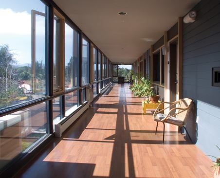 As a result of this simple move, every apartment opens onto a sunny, window-lined corridor rather than a dark, double-loaded one. And Faleide specified exterior door and window frames and fiber-cement walls for the units’ glassed-in front elevations, heightening the hallway’s resemblance to a street. “People put their outdoor furniture and plants outside their doors,” he says. “They sit there when they want to be part of a community.”