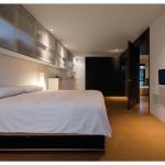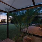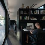 Light rusted steel columns support polycarbonate roofs for protection from the Arizona sun, while an operable polycarbonate awning controls south light at the kitchen/office structure. Reflective surfaces make the courtyard seem even larger than it is. Interiors are bone simple, divided largely with movable millwork “boxes” that easily are shifted to reconfigure spaces. “Sometimes we need just two bedrooms, and sometimes we need five,” Matthew Salenger explains. “When we’re entertaining, the office space disappears.”