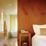 Neal Schwartz, AIA, describes the original master suite in this Bay Area Mission-style house as “a weird warren of rooms where you had to walk through the closet to get to the master bath.” He replaced the maze with an open, multifunctional room for sleeping and bathing, and infilled it with a mahogany chamber containing water and clothes closets. “I tried to solve everything with a single box that you can walk around or through,” Schwartz explains. “It gives you a lot of bang for your buck.”