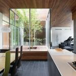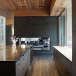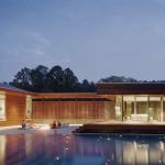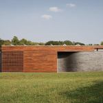 Curved House isn’t curved, per se, explains architect Matthew Hufft, AIA, LEED AP. “It’s really this modern box,” he says. But subtle radii appear throughout, most prominently in the brick walls that mark the building’s south and west façades. The gray/black brick waves slip behind ipe-sided walls, cupping the entrances to the main house and cabana on their inside curves and building undulant shadows on their outer surfaces. The jury praised the house as a whole for “how it explores the manipulation of forms,” calling this detail in particular “really lovely.”