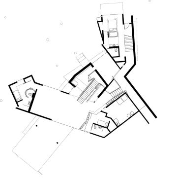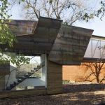 Those ideas took shape as canted walls, a polycarbonate catwalk, mezzanines, and stairs that seem to fly. “We did have a basic set of construction drawings to get permits, but as soon as we started building, we pretty much threw the plans out,” Brown says. The material palette—hot-rolled rusted steel, concrete floors, and thousands of 1×2 poplar slats from The Home Depot—ties the project to the neighboring barns and abandoned farm implements. Also included are green roofs, high-efficiency heat pumps, and plumbing and wiring for future solar panels and a geothermal system.