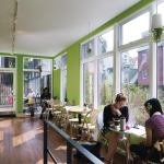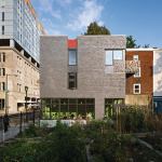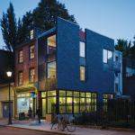 A “sliver” is an appropriate description, for the architects had only a 9½-foot site between the existing building and a community garden. On this space, the client had plans for a less ambitious one-level atrium adjoining an existing cafe, “but then it evolved into a three-story project,” says architect Kevin C. Rasmussen, AIA, LEED AP.
