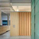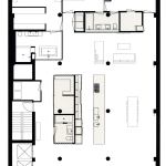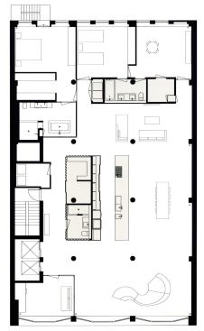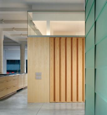 Desai/Chia’s build-out of this “cavernous space with no light in the back” introduces both light and logic with permeable partition walls. Vertical wood planks capped by bands of clear glass enclose private rooms and define open living areas. Light filters through the offset boards and the glass bands at night, emphasizing the high ceilings.