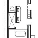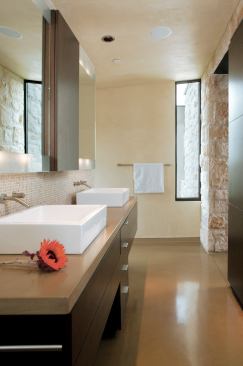 Slick, low-maintenance specs that smoothly shed water dominate the master bath. Polished stained-concrete floors found throughout the house continue into the bathroom. Simple flat doors and drawer fronts make up the millwork pieces. Plaster walls and ceilings come together without the crutch of trim or molding. Even the stone gets reinvented as sleek, small-scale tiles covering the wet walls behind the vanity and shower. Stone also plays off itself in the guest bath, where both rough and refined versions intersect via walls and flooring.