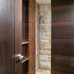 Davis says he selected the glossy finishes to emphasize the stone’s texture, rather than mitigate it. “We really wanted to express the stone as both an interior and exterior material, so we tucked a window up tight against the wall,” he says of the edgy master bath fenestration. Each rock had to be handmilled to receive the window frame and create a tight seal. The tall, slender window lets in abundant natural light, while its positioning preserves bathers’ decorum.