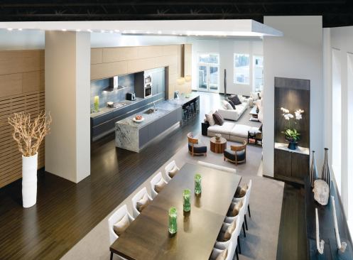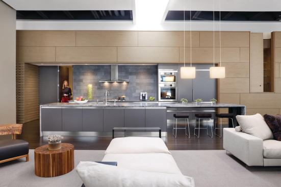 The resulting build-out celebrates sheer volume with a kitchen/living/dining room Walker describes as resembling “a big Italian courtyard. Everything opens off of that space.” A long wall clad in Koto wood panels forms the inboard boundary of the room. “The kitchen kind of embeds itself into that wall,” says Walker, who set the area apart from its wood surround with a grayscale palette of stone counters, laminate cabinets, and stainless steel appliances and accents. Dark-stained bamboo floors underscore the room’s scale.
