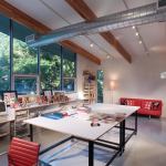 He staked his claim to a 0.2-acre property there in 2008. Over the past two years, he’s gradually designed and built a 24-foot-by-80-foot corrugated metal-clad box to serve as Shipley Architects’ workspace and calling card. The building features a healthy modicum of flexibility; its 18-foot-high ceilings can accommodate an eventual mezzanine space, and Shipley structured and wired the project to support two rooftop apartments in the future. A pair of small restroom buildings, also metal-clad, lies separately from the main building—“so we don’t encumber the big space with service-type space,” Shipley notes. Tubing embedded in the concrete floors supplies radiant heat as well as radiant cooling.
