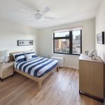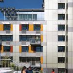 The stepped building shell presents south-facing mounting surfaces for photovoltaic panels, which generate enough electricity to supply the common areas and outside lighting. To promote daylighting and natural ventilation and minimize air conditioning use, most of the 222 units have two exposures, and all have operable windows. An energy-efficient shell, mechanical systems, and lighting—plus rainwater collection and other sustainable features—earned the building a LEED Gold certification. “But we were also interested in social sustainability,” says Stein, who notes that the development’s 40,000 square feet of open space includes vegetable gardens, the courtyard’s playground and amphitheater, and other community gathering places.