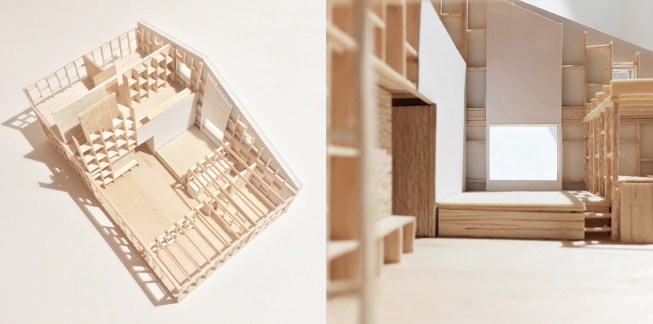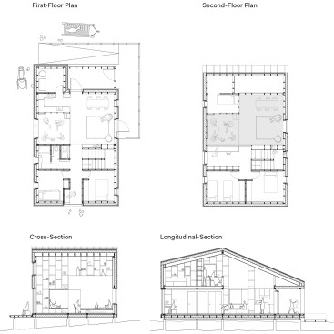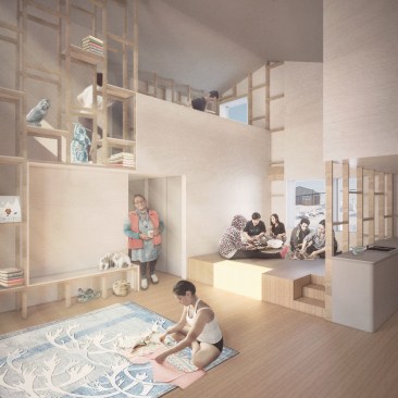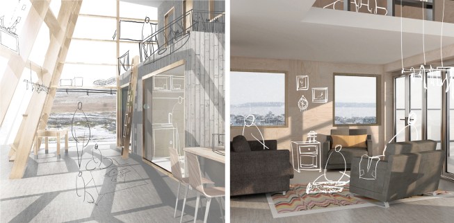 Alexandre Morin designed a housing prototype and carved its living room into a diverse series of spaces, so that a large family of eight or nine people can cohabitate while pursuing different activities. The scheme prioritizes views from the group areas to a nearby river and other landscape features, allowing the residents to maintain their connection to nature even while staying indoors together through the winter months.