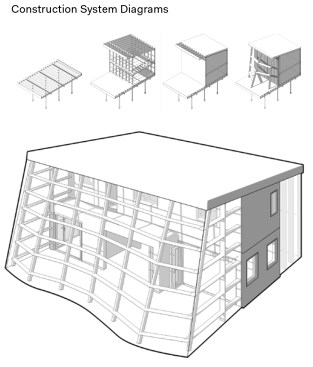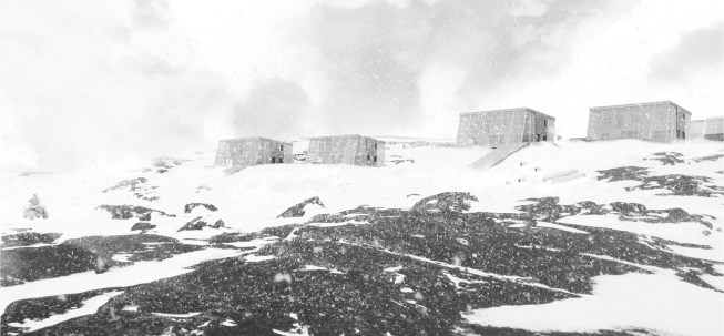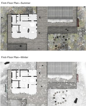 Mélissa Mailhot’s proposal for a new type of dwelling features a large enclosed porch that is inspired by the construction of Inuit kayaks. The house rises on piers to minimize impact on the landscape and is constructed of recycled and recyclable materials. The porch can be opened to the rest of the house in warmer months, increasing living area, and it provides a sheltered connection to the landscape and an insulating buffer for the living spaces during the harsh winter.