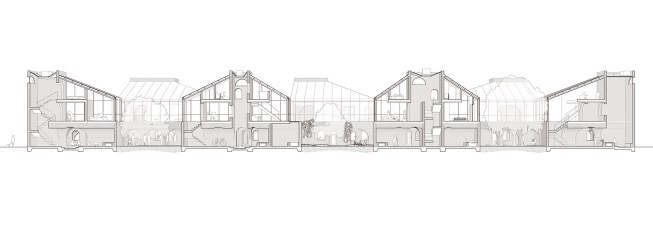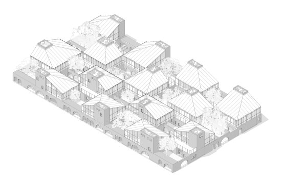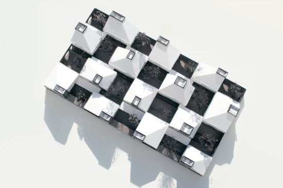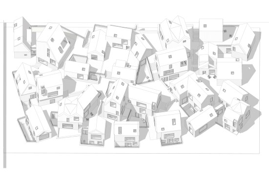 Allison Walvoord and Krishnan Mistry designed a plan that challenges the notion that one household must occupy one building volume. In Urban Village, dense clusters of living spaces are arranged around shared spaces of different scales, but some units extend across multiple volumes while other larger volumes can hold multiple units. The scheme examines how the seemingly opposing ideas of individual expression and collective living can be embodied in a single complex.