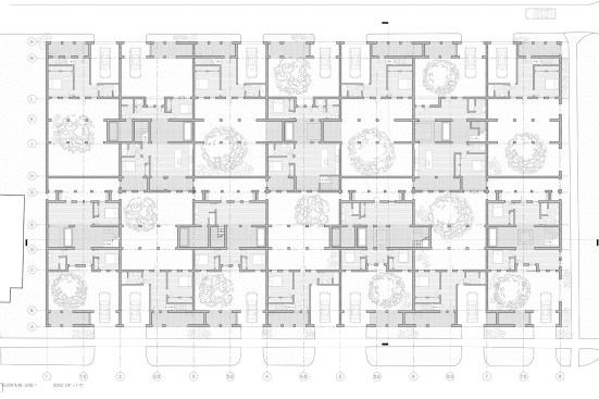 Paul Hazelet and Rebecca Gawron alternated enclosed living areas and open-air patios in an offset grid; interstitial spaces hold circulation and services. Load-bearing masonry structure contrasts with lush vegetation in the gardens, and the dispersed outdoor spaces ensure views of greenery from each unit and a higher ratio of windows per unit than a standard mid-density complex would allow.