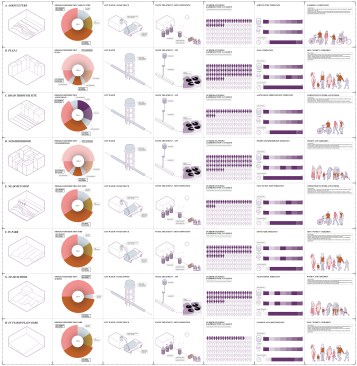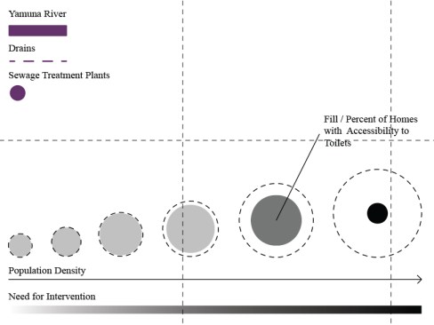 Approaching Sanitation: A Typological Response to the Study of Sanitation Infrastructure in New Delhi | A lack of bathroom infrastructure means that one of the main contaminants of the Yamuna River is fecal matter. Students analyzed the bathroom infrastructure in the region (opposite), comparing population density with the percentage of homes with toilet access to determine areas that most need intervention. With that information, Darcy Engle developed proposals ranging from rooftop facilities, to community towers that accommodate toilets and areas for bathing and laundry (above and right), to large public facilities that serve as community catalysts, incorporating retail and child care.