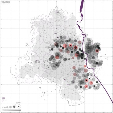 The most recent studio, involving 13 students, focused on a 24-kilometer stretch of the Yamuna River, which bisects the city and provides both its drinking water and its sewage drain. The students divided into teams to research different aspects of the river, including its uses, its impact on health, and the housing stock surrounding it.