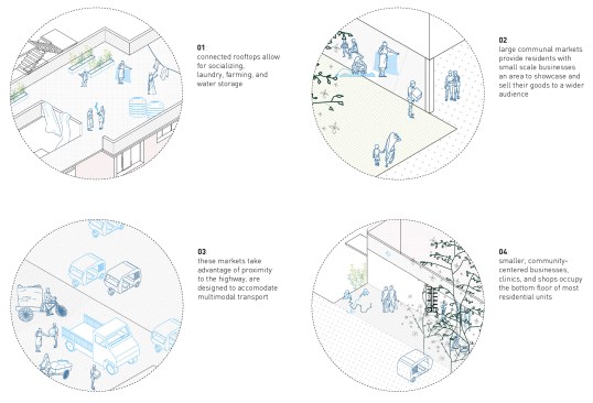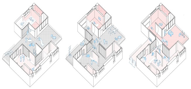 Mixed-Use Social Housing for the Yamuna | Katherine Rush’s proposal rethinks high-density residential typologies in the region, proposing a user-controlled “gradient of privacy” that can change over the course of each day. An analysis of existing low-income housing in New Delhi showed that many residents of dense slums live with only 1 to 5 square meters of space per person. With stackable furniture, movable partitions, and terraces and courtyards shared by neighbors, this model provides 8 to 10 square meters per person, while giving residents more agency over their surroundings.