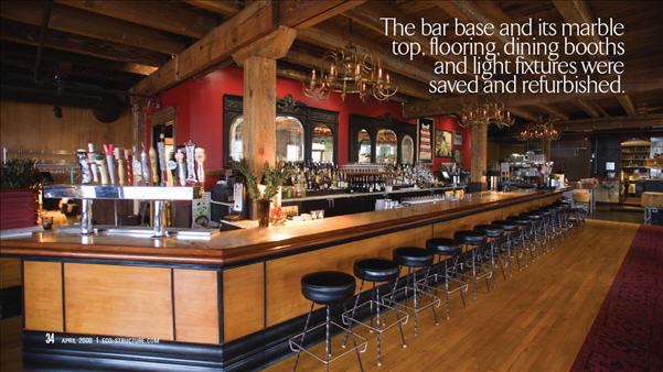 Incorporating salvaged items also posed new design challenges, according to Schoessler Lynn. “Kim found the dark-wood back-bar that was ideal for a Northwoods-style supper club. Later, when she purchased some reclaimed wood flooring, this not only had to relate to the bar and other interior design elements, it had to be refinished in accordance with LEED criteria.” Thus the team had to find a low-VOC stain, and dust caused by sanding had to be captured or exhausted from the work area.
