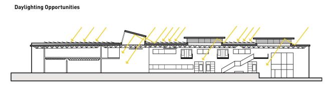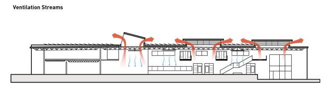 Since conserving existing resources was of primary importance, the design team preserved nearly 65 percent of the original warehouse’s shell and structure. The team chose galvanized corrugated metal panels for the interior breezeways, which are unscrewable and replaceable for future tenants if desired. The existing concrete floor was retained because of its durability and replicated on the second floor, eliminating dependence on extraneous finishes. High-efficiency ductless mini-split systems were also installed, allowing for individual control over the conditioning of interior spaces. Twelve percent of the building can be ventilated through operable windows.