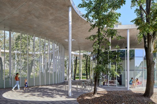 “The building has a building area of almost 4,000 square meters and the relationship with the environment is very close, even intimate, and the relationship with nature is exceptional. The conceived and implemented functional idea of the passable building turned the shortcomings of the situation into uniqueness of the project: the area of the triangular plot ‘absorbed’ the building intuitively merging with the surrounding nature, thus creating a park and public space inside the building.”