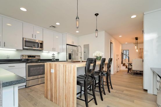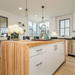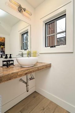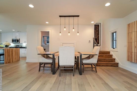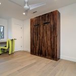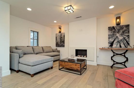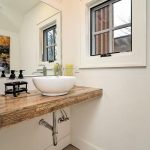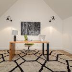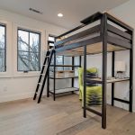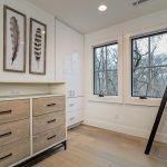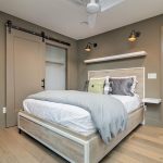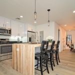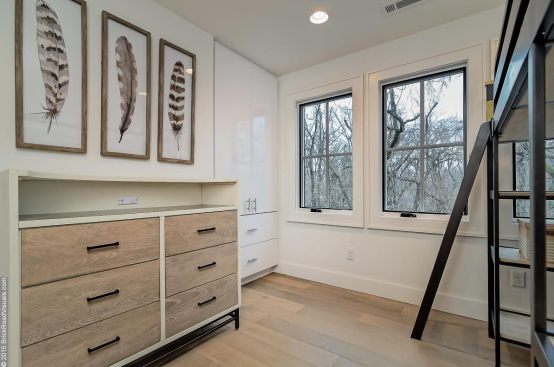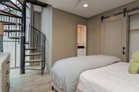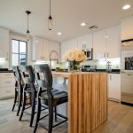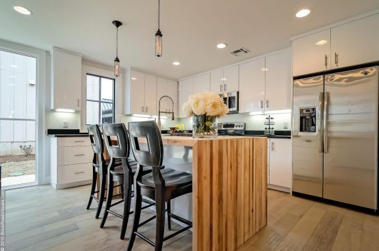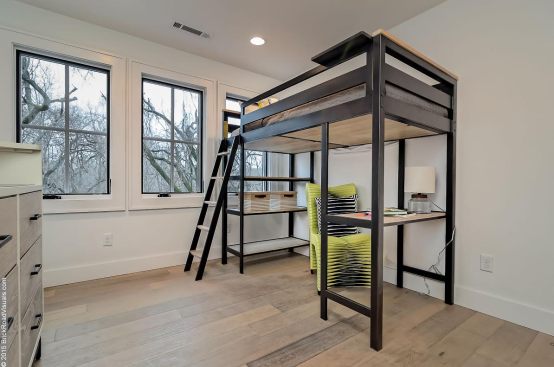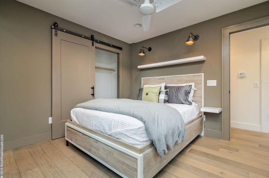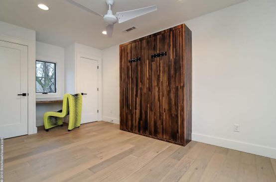 A neutral, restrained interior palette combined with plenty of natural light emphasizes the rustic, handcrafted furniture that punctuates each room, such as butcher-block kitchen surfaces and a robust wooden armoire inside one of the bedrooms. These were handcrafted by EcoVet—a local company that employs veterans to repurpose unused butcher block and metals from decommissioned semi-trailers into eco-friendly furniture. The pieces are optional upgrades, says GreenSpur founder Mark Turner.