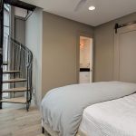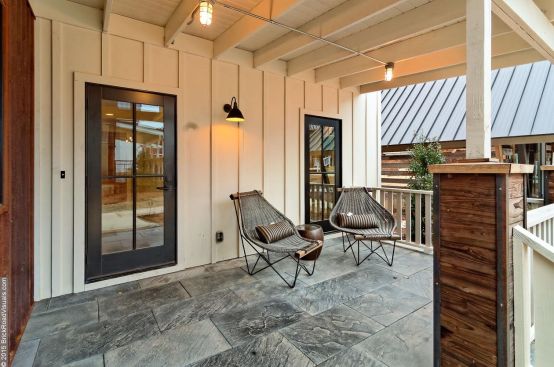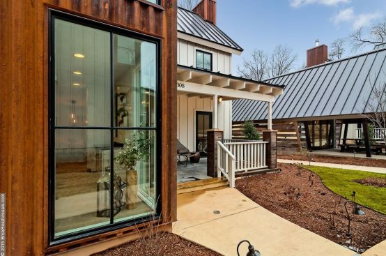 At 1,750 square feet, Black Apple’s two-bedroom Silo units are the four largest (and, at three stories, the tallest) models of the 11 homes in the community and anchor each corner of the development’s perimeter. The Silo units are a riff on their namesake agricultural tower—coated with copper and meant to rust—paired with a second volume with the proportions of a traditional farmhouse. The attached volumes feature generous front and back porches that provide a comfortable indoor/outdoor experience.