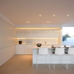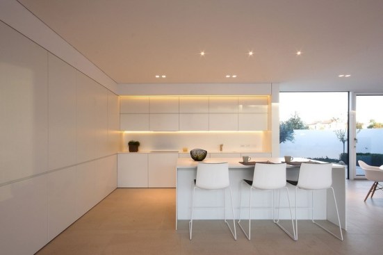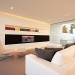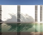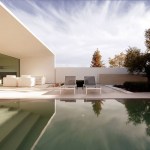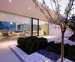 JM designers has achieved the goal of creating an air of openness in the home. Transparent sides in the indoor living zone open to two patios of different sizes. The larger patio, to the west, features a long swimming pool and planted inserts, while the smaller patio stands to the east. The outdoor areas are low-maintenance, as most surfaces are paved, and low-maintenance plants like olive trees were selected for the landscape due to their minimal care needs as well.