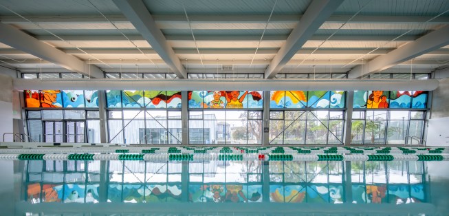 “The new pool center comprises a 3,550-square-foot clubhouse, pool building and public art installation with glass by Pulp Studio.”