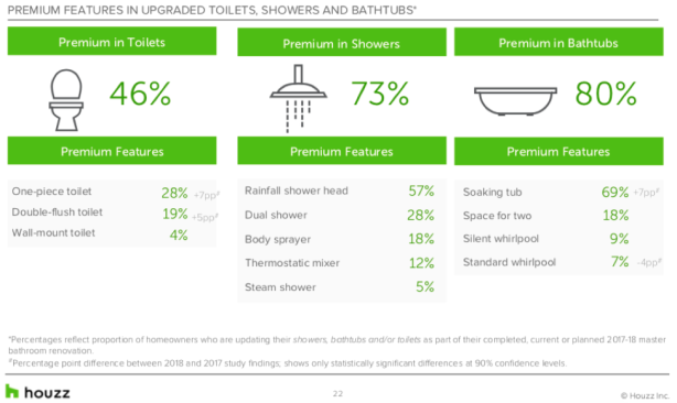 Premium options in bathroom, such as one-piece toilets, double-flush mechanisms, dual showers, and rainfall shower hears are becoming increasingly popular among home renovators.