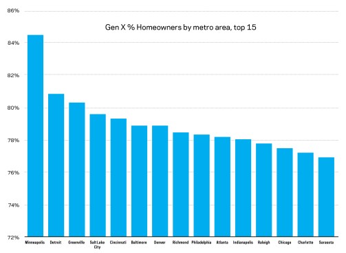 - Homeownership is highest in more affordable markets. The homeownership rate among Gen Xers is particularly high in places like Minneapolis; Detroit; Greenville, South Carolina; Salt Lake City; and Cincinnati;