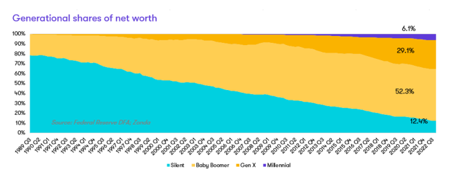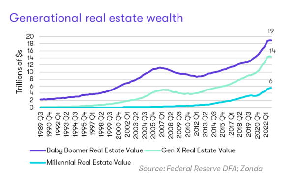 Notice that Gen Xers endured a significant drop in real estate wealth through the Great Recession but have since strongly recovered. Gen X real estate wealth of $14 trillion is even catching up with the baby boomers at $19 trillion.