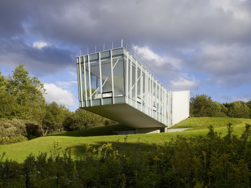 “The house, designed by Warren Schwartz, is the summer residence of his wife, Sheila Fiekowsky, a member of the Boston Symphony Orchestra. The house is located near the top of a hill, and, small as it is, takes advantage of the location to command the landscape. The building skin uses industrial materials, with commercial glazing and corrugated anodized aluminum siding. The living area, at the end of a forty-five-foot cantilever, opens onto spectacular views.”