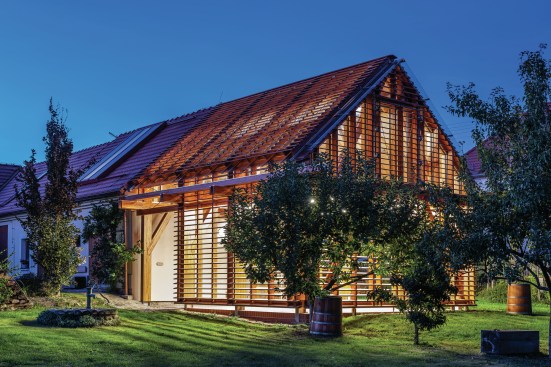 “In terms of articulation of form, the extension is in complete harmony with the original farmhouse. In terms of structure, however, the transparent timber frame, along with its zen atmosphere, is a complete contrast. The ground floor serves as a storage for firewood. Once through, one can climb up a spiral staircase onto a bridge connecting the old attic with the new. Each of the spaces encloses a single room. The old attic serves as an astronomical observatory, the new as a lookout. The plank-assembled exterior shading of the new attic allows one to peek through and observe the surrounding landscape. The observatory in the old attic, on the other hand, is a dim space that provides a lot of privacy, since light only comes in through a narrow window.”
