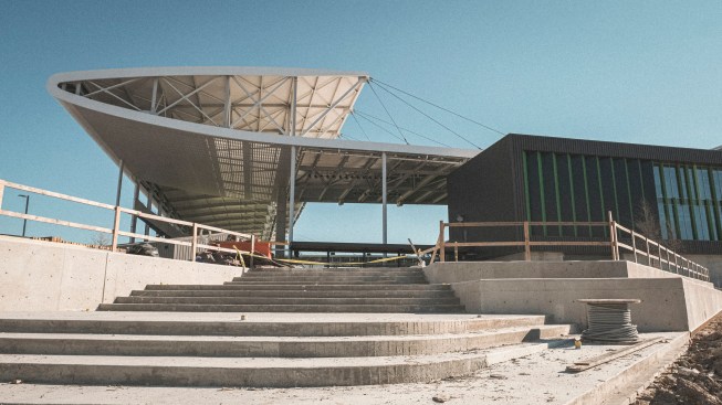 “The canopy enclosure features a combination of customized curved metal panel systems on the bullnose, soffit, and edges; and single-ply roofing on the top side of the canopy at the north and south end to provide protection to a stage.”