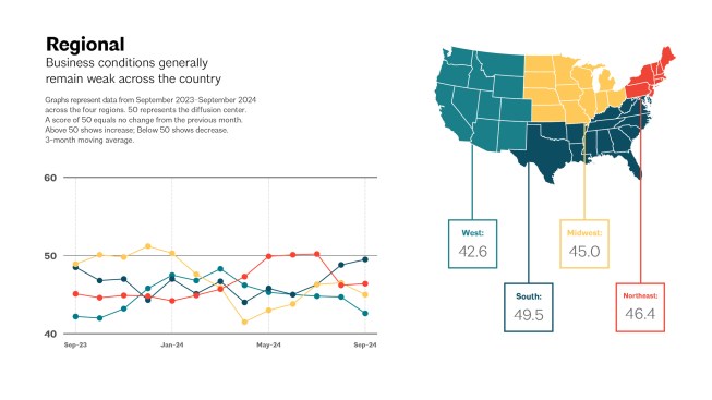 • Regional averages: South (49.5); Northeast (46.4); Midwest (45.0); West (42.6)