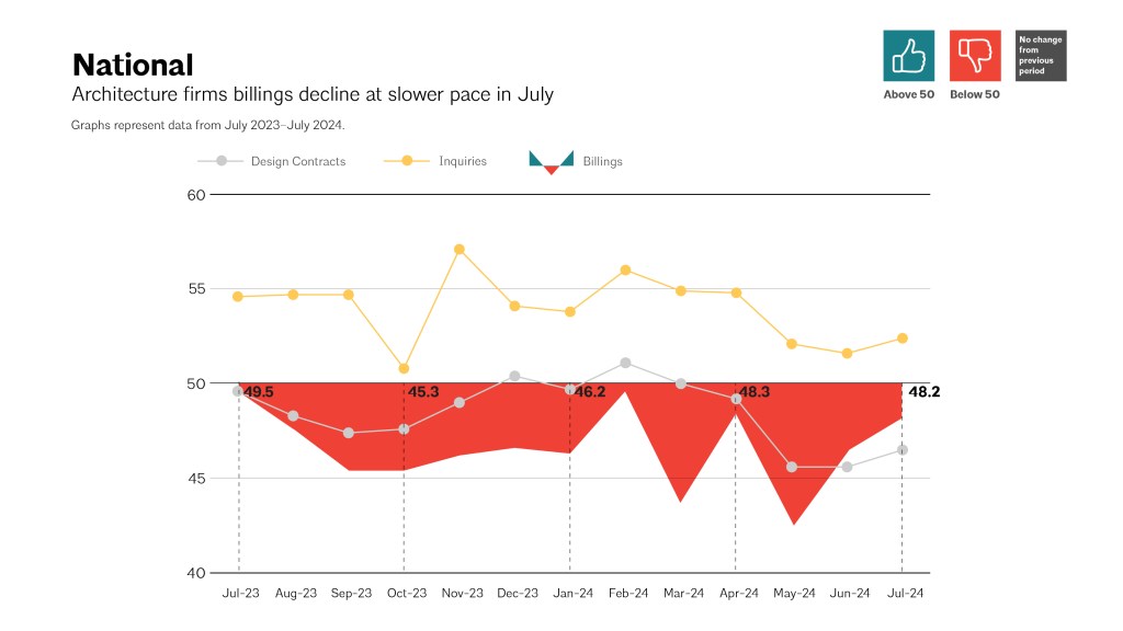 Architecture firms across the United States are grappling with ongoing financial strain, as billings continued to decline for the eighteenth consecutive month, according to the latest Architecture Billings Index (ABI) from the American Institute of Architects (AIA) and Deltek. The ABI score for July was reported at 48.2, signaling that while fewer firms reported declines in billings compared to the previous month, over half of those surveyed still face difficult business conditions.
