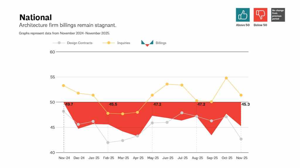 Business conditions at U.S. architecture firms remain locked in a prolonged slump, according to the latest data from the American Institute of Architects. The AIA/Deltek Architecture Billings Index (ABI) for November registered at 45.3, extending the industry’s downturn to a 13th consecutive month of declining billings—and marking the 35th time in the last 38 months that the index has fallen below the growth threshold of 50.