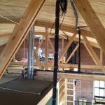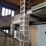 Much more promising is the renovation of the first structure, a concrete rectangle dating from the post–World War II era. The Office for Metropolitan Architecture (OMA) has just started renovating it in the lightest manner possible, letting as much of the accumulation of openings, patches, and graffiti that have accumulated on the structure over the decades remain. What is visible now is the renovation of another structure, which once housed a cinema, into the Garage’s offices. Local architect Olga Treivas of FORM followed what by now is becoming the institution’s signature style of minimal intervention and a highlighting of everything that remains, from the grandeur of the space to the accumulation of paint and textures so redolent of past uses. You enter into a double-height space and then move up flanking staircases, stripped down to their bare concrete onto which the architect added dollops of new pours to repair and stabilize the structure, past brick columns encased in new steel girdles, and onto a mezzanine, where the offices stretch out around conference rooms. The roof is new and consists of wood trusses holding up a wood ceiling. Also evidently new are some of the floor finishes and the equipment that make the space habitable and usable, but you are overwhelmed everywhere you look by fragments from the past. Bits of plaster retain color, hinting at decoration, while the raw concrete and brick evoke an elemental state, as if the Garage was starting from a new beginning with old roots.