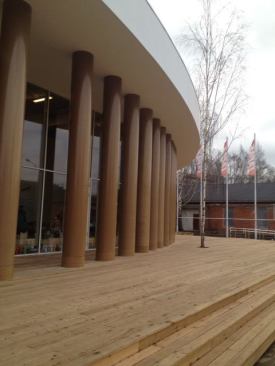 It houses, appropriately enough, an exhibition on the park’s history. The pavilion is more or less standard issue for Ban, a circle of cardboard columns surrounding a round hangar for exhibitions. The display on Gorky Park’s history is interesting, but falls flat because almost all of the drawings are reproductions, and there is not enough material in the dimly lit space. Little of the vivacity and invention that architects and designers displayed all the way from the beginning of the 20th century in this free zone for display comes through.