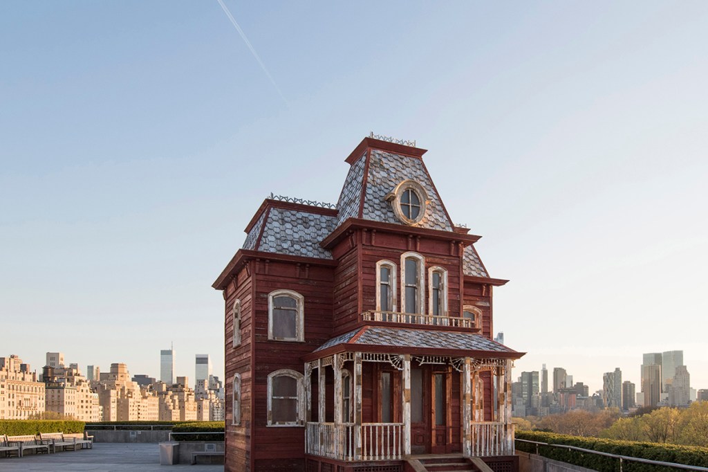 The latest installation on the Metropolitan Museum of Art’s rooftop combines two architectural styles, the iconic red barn and a Victorian house, into one structure. Constructed of salvaged materials from a disassembled red barn, this Victorian is no Painted Lady. This house was inspired by the one from Alfred Hitchcock’s 1960 film Psycho, which was inspired by Edward Hopper’s 1925 painting House by the Railroad.
