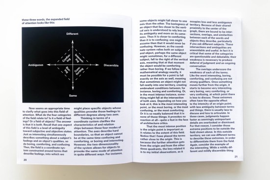 The closest Atwood comes to a recipe is the presentation of different techniques and approaches that span his favorite terms: boring, confusing, and comforting. These all present qualities, he claims, that break down hierarchies, blur edges, diffuse points of interest, and in general offer a cloudy, messy set of not-quite-forms and not-quite-interpretations. As he writes: