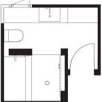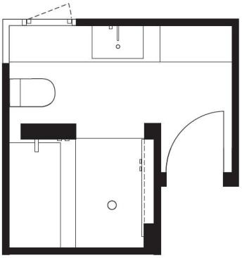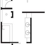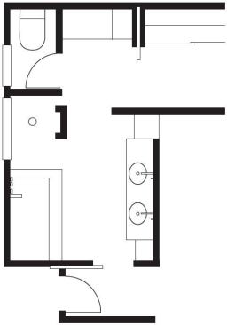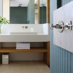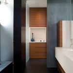 The master bath of 543 House (in the first two slides above) bears a strong family resemblance to the kitchen that occupies the space just below it. Its long sink counter and splash surfaces are white Corian, its flush-front cabinetry is teak, and its geometry favors strong, monolithic elements. A wall finished in blue integral-color plaster stacks above the blue plaster wall of the kitchen. Architects Barbara Callas and Steven Shortridge, AIA, added to the mix with black granite at the floor and in the bathing area. Glass tile lines the exterior wall, and etched glass panels enclose the toilet compartment.