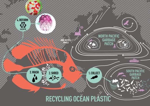 According to research at UC Santa Barbara’s National Center for Ecological Analysis and Synthesis, about 4.8 million metric tons of plastic waste are poured into the world’s oceans from land each year. A huge portion of this waste is high-density polyethylene (HDPE), which is a non-biodegradable plastic used for manufacturing items like plastic bottles or yogurt pots. To construct these projects with this very material and still make it aesthetically pleasing, the firm will collect the waste and sort them into colors, and then shred it. The smaller bits of the torn apart plastic would then be poured into individual moulds, and reheated to create a new piece that would be be similar to cladding tiles traditionally used for the exteriors of buildings.
