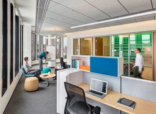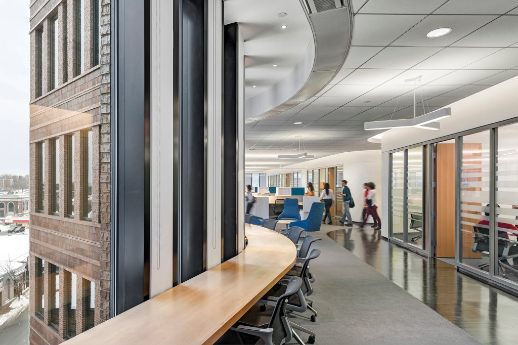 The bulk of the BPS employees will work in private offices on the third through the sixth floors. On the Washington Street side, the architects have half-exposed the fire stair to the street, in hopes of encouraging more employees to walk between floors rather than take the elevator. The offices are not lavish, but they are dominated by daylight and views through the floor-to-ceiling windows banded by aluminum. It’s a Silicon Valley-lite landscape of white desks, colorful breakout spaces, bright blue kitchens, and glass-fronted conference rooms. The outside curves have been cleverly incorporated into the corners and soffits around the core, so one moves smoothly in and around the various lobes of desks and communal spaces.