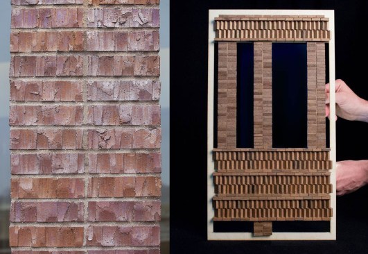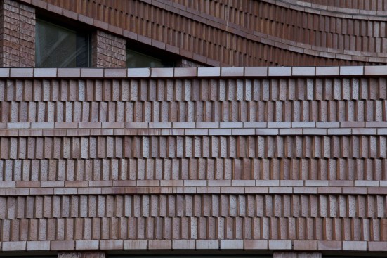 It took some doing to convince local masons that they could accomplish the task the architects had set out, including the two-brick-wide columns between many of the windows. The rotated soldier pattern, originally conceived with the blocks at a 45-degree angle, had to be tweaked because the holes down the center of typical bricks would have been left exposed. To avoid the extra expense of custom pieces, the architects changed the angle to 30 degrees. As I stood outside with Vizgaitis by the broad, terraced entrance on the bus station side—where most members of the public will likely enter—he pointed out the light hitting the one interior corner, turning the vertical bricks into glowing fish scales.