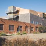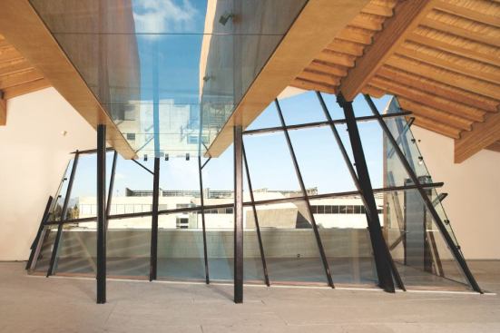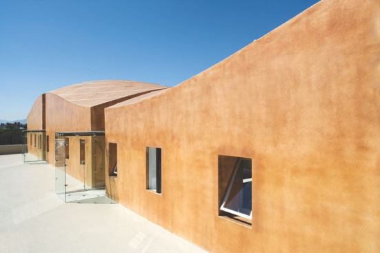 A renovated warehouse topped by a trapezoidal box that serves as a conference room