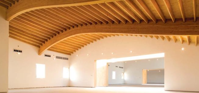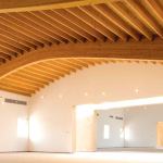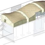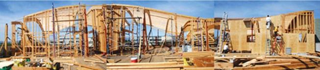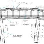 Because Moss wanted to expose the wood structure on the interior, the exterior surface had to perform as an insulated package. The assembly is composed of a plywood shear diaphragm on the interior (two layers of 1/2-inch plywood, thin enough to flex over the curved beams and rafters), with rigid insulation and fire-resistant cement board sheathing on the exterior. A consistent 3-inch cavity separates the inner and outer surfaces by means of a flexible steel track that conforms to the curves. This consistency was important to preserving the geometry established by the beams: A sloppy installation of sheet material would have degraded the shape. Spray-foam insulation was applied between the ribs of the steel track; its superiority over rigid foam was, in this application, a no-brainer.