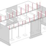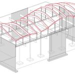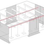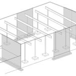 The underpinnings for the rooftop addition were put in place in the late 1990s, when Moss first converted the building into a loftlike sound stage. A redundant steel structure was inserted along the perimeter, anticipating later vertical expansion. (See the first drawing in the sequence of axonometrics in the image gallery.) Buried in the walls of the current addition are steel and wood columns that extend upward from the perimeter frame to support the new undulating roof.