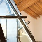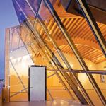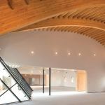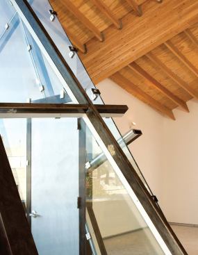The complex roof geometry is a 42-foot-wide creation of glue-laminated wood beams. Each beam was laminated and milled to a unique curvature and has a continuous changing bevel on the top surface, cut on a mammoth CNC (computer numerically controlled) milling machine according to 3-D digital files provided by Moss’ office. The CNC machine also plotted small holes on top of the beams to indicate the center lines for the rafters, whose 16-inch spacing varies ever so slightly from beam to beam to adjust for the fact that each beam is a different length.