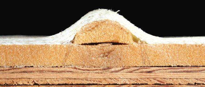 Empirical tests were done in the studio to identify a gypsum board that had adequate flex and sufficient ability to bond with the final coating of fiberglass. The cured fiberglass popped off some cement-board products, or it made the boards fail internally and rip apart. The ultimate specification was a cement board with integral glass fibers that could penetrate the resin applied to the outer surface.